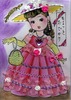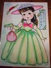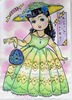 爽やかさがテーマのドレス。いつもの色鉛筆と金・銀のラメで塗って、それほどデコっていませんが、レース感がでていて、さすがです。イヤリング、ネックレス、ハンドバッグの持ち手も緑と黄色で統一されています。そして、ひさよさんはいつもお顔、メークが素晴らしいです。