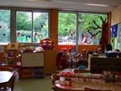左:園内の様子、右:ぬりえの用紙などが入っている工作用テーブル付近